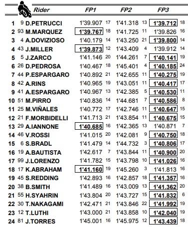 Quando dal cielo cade la pioggia, ecco che Danilo Petrucci veste la maglia da super eroe. Sotto la tuta, c’è il costume da Super Man, o meglio ancora, da Flash, vista la velocità che lo ha portato in testa nelle Libere 3. Il pilota della Pramac dimostra ancora una volta di essere a suo agio sul bagnato: grazie al suo 1:39.712, strappa il primo posto a Marc Marquez nella classifica combinata. Andrea Dovizioso chiude le Libere 3 al secondo posto (è 3° nella combinata). Male le Yamaha ufficiali, entrambe fuori dal Q2: Maverick Vinales è 11°, Valentino Rossi (autore di una caduta senza conseguenze) è 14°. Andrea Iannone non riesce a migliorare il proprio tempo: è 13°, sarà costretto a passare dal Q1. Jorge Lorenzo, nuovamente in pista dopo i problemi al posto, non riesce ad andare oltre la 17^ posizione nella combinata. Xavier Simeon dichiarato “unfit” per il weekend, dopo gli esami medici effettuati in seguito alla caduta nelle Libere del venerdì. Le cause dell’infortunio sono ancora da accertare.