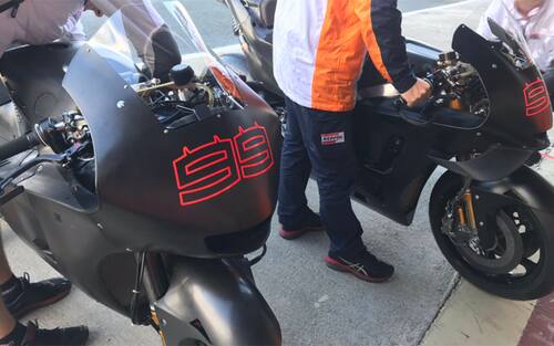 La nuova Honda HRC di Jorge Lorenzo. Livrea nera e priva di sponsor per il maiorchino, che ha fatto conoscenza con la sua nuova moto. Per Jorge 18° crono ma buone sensazioni in vista di mercoledì, quando potrebbe cominciare a testare una moto più evoluta (Foto Twitter)