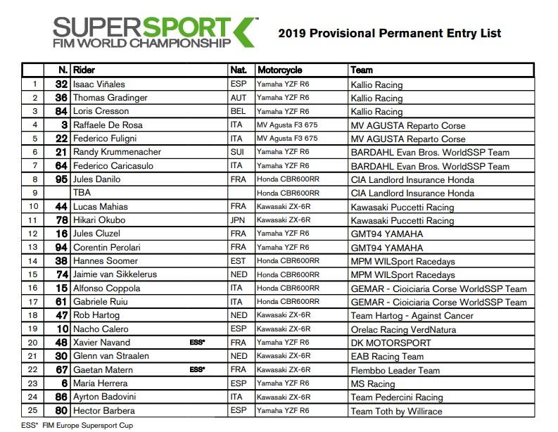 Venticinque i piloti al via nel mondiale Supersport, tra i quali ci sarà anche Maria Herrera che fa il salto di categoria dal SSP300. Classe nella quale resta Ana Carrasco, campionessa del mondo in carica, che correrà con la Kawasaki del team Provec. Sei gli italiani: Raffaele De Rosa e Federico Fuligni con la MV Agusta F3 675 del Reparto Corse della casa di Schiranna, Federico Caricasulo (Yamaha YZF R6), Alfonso Coppola e Gabriele Ruiu (Honda CBR600RR) e Ayrton Badovini su Kawasaki ZX-6R.