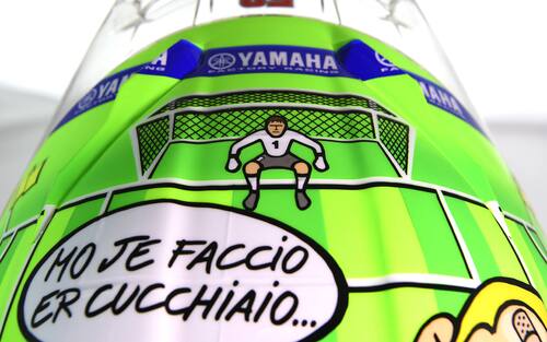 Attenzione però. I caschi da collezione non sono limitati ai GP in terra italiana. A Montmelò 2008, ecco Rossi sfoggiare un casco "calcistico" in onore della Nazionale, impegnata agli Europei -