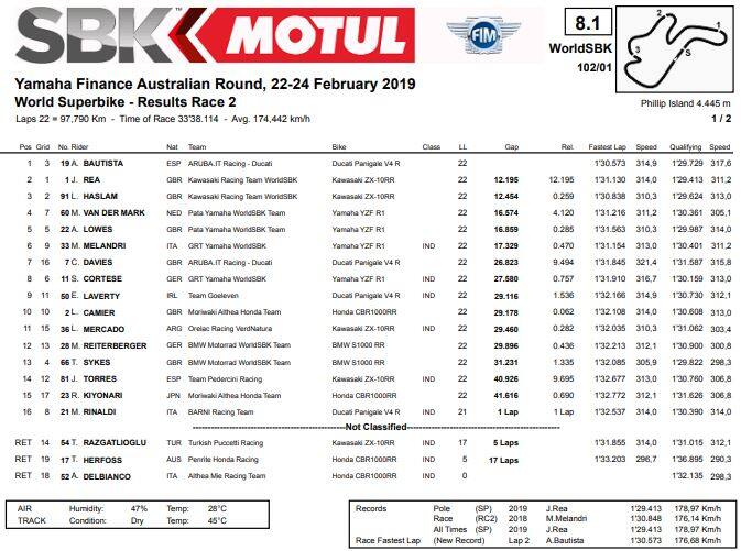 Il risultato di Bautista vale molto anche in relazione a Jonathan Rea che negli ultimi anni è sempre stato considerato un pilota buono per la zona alta della MotoGP. Rea sullo stacco in partenza è un gatto, ma a Bautista - che dalla MotoGP proviene - basta girare il gas a fondo e infilare tre marce a raffica per passargli davanti ed entrare primo alla prima curva. Da lì in poi fa tutto da solo, proprio come era già successo in gara1. E’ come se non avesse la necessità di gestire le gomme che a Phillip Island sono un problema storico. La domenica si presenta con dieci gradi di temperatura in meno, ma Bautista è carico di più. Rea, che dopo gara 1 aveva raccontato di aver corso al 60% delle sue possibilità, continua sulla stessa linea di Gara1, giocando un gioco pericoloso con il compagno di marca e team Kawasaki Leon Haslam di cui riesce a liberarsi solo nel finale che vale il podio ad entrambi: Rea secondo, Haslam terzo.