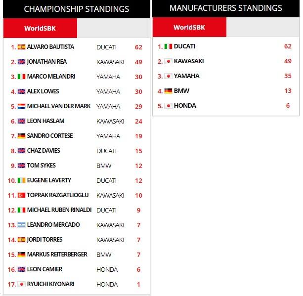 Alle loro spalle è un pacchetto di Yamaha con Michael Van der Mark quarto su Alex Lowes e su Marco Melandri, che a metà gara sembra in palla e pronto alla rimonta come in Gara 1, ma poi finisce di soffrire lì chiudendo sesto davanti a Davies.