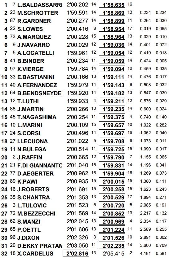 C'era attesa per la Moto2 dell'era Triumph. Il cambio di motore ha portato una rivoluzione tecnica accompagnata dall'ingresso dell'elettronica che cambia molto l'approccio alle prove, le strategie nonché lo stile di guida. Il più veloce ad adattarsi alle novità, stando ai risultati del venerdì di Doha, è stato Baldassarri. Quindi un pilota della vecchia guardia per così dire, a conferma del fatto che l'esperienza pesa, almeno in questa fase inziale del campionato. Alle sue spalle troviamo infatti Schrotter, il sorprendente Gardner, l'ottimo Lowes, dominatore dei test invernali e Alex Marquez, atteso protagonista della stagione. A ulteriore riprova, sono solo due i rookie classificati nei primi quattordici: il migliore, Enea Bastianini, decimo, e poi Martin, iridato della Moto3, quattordicesimo.