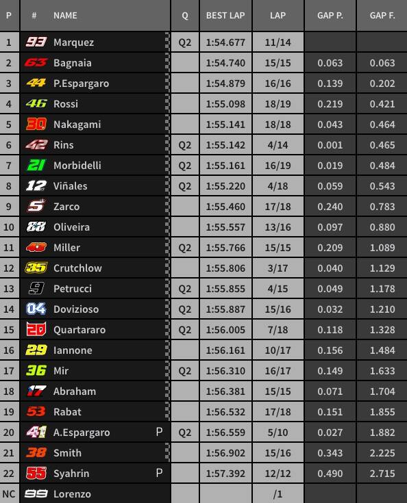 La classifica combinata: Rossi fuori dal Q2