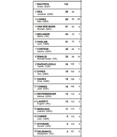 In entrambe le gare Alex Lowes si è issato sul terzo gradino del podio, confermando l’ottimo momento del pilota inglese: per tutto il weekend Lowes ha fatto la differenza sul compagno di squadra Michael Van Der Mark, quarto sia al mattino che nel pomeriggio. Nelle due frazioni, “Magic Mike” ha guidato un gruppetto che ha visto chiudere quinto Leon Haslam e sesto Marco Melandri, ancora alle prese con gli scuotimenti della sua Yamaha sul dritto. Il ravennate rimane in testa alla classifica indipendenti, con Yamaha GRT che piazza Sandro Cortese due volte settimo e resta leader nella graduatoria team.