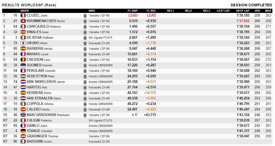 Cluzel si aggiudica la seconda gara del campionato Supersport 600, appaiando Krummenacher in testa alla classifica. Lo svizzero è secondo, seguito da Caricasulo che chiude il podio. Vinales sul livello dei primi, De Rosa è quinto con la prima moto non Yamaha