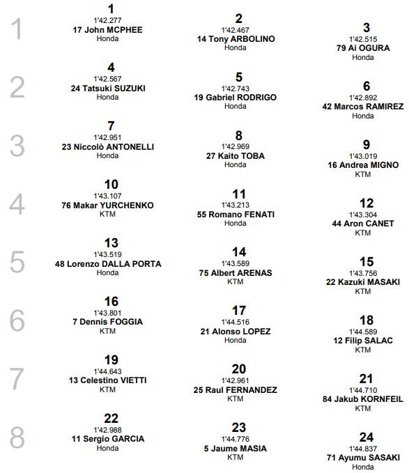 Piove, non piove. In Q1 dopo pochi minuti i piloti sono rientrati a cambiare le gomme da bagnato. In Q2 molte chiazze d'umido rendono ancora un po' insidioso il tracciato, comunque meno veloce rispetto al venerdì. Si sa chi i piloti britannici vanno a nozze con queste condizioni. Alla fine è stato infatti John McPhee, passato dalla Q1, a strappare la pole (la quarta in Moto3) tante quante Romano Fenati che ha invece dovuto accontentarsi della tredicesima posizione. A sua discolpa i postumi della brutta caduta di ieri che gli hanno lasciato una caviglia dolorante. Per lui si prepara una gara in salita. Diversamente dal suo compagno di squadra, Tony Arbolino, che ha messo a profitto la sua sensibilità sull'asfalto umido. E ha confessato con onestà di aver approfittato della scia di un suo avversario, Tatsuki Suzuki. Un ottimo secondo posto per il pilota lombardo, nono in campionato. Non c'è da meravigliarsi nemmeno tanto se con quest’asfalto è saltato fuori il turco Can Oncu, sorprendente vincitore al debutto in Moto3 sotto la pioggia Valencia. A proposito di Suzuki, il pilota del team Sic 58, poteva forse meritarsi qualcosa di più perché, in forma ieri sull'asciutto, era stato il più veloce nel turno mattutino, sotto l'acqua. Davanti ad Andrea Migno, finito poi in undicesima posizione durante la qualifica. Chi si aspettava anche un possibile exploit di Antonelli, che deve difendere il suo secondo posto in campionato, è rimasto parzialmente deluso. Domani il romagnolo scatterà dalla settima posizione, quindi con la possibilità di puntare al podio. Che nel suo caso può valere moltissimo perché uno dei suo avversari diretti per il titolo, Jaume Masia, terzo in campionato staccato di 12 lunghezze, partirà dall'ultima fila. E anche il leader del campionato deve prepararsi a una complessa gara di rimonta, partendo dalla quattordicesima piazzola della griglia. Complessa per via della possibilità di pioggia che incombe sulla gara. Nel complesso una qualifica non molto favorevole alla pattuglia italiana: detto di Arbolino e Antonelli, Fenati e Migno, ricordiamo anche Dalla Porta (quindicesimo) caduto per la quarta volta in due giorni, Dennis Foggia (diciottesimo), Vietti (diciannovesimo) fermatosi davanti all'ostacolo della Q1, e Riccardo Rossi (ventiseiesimo).