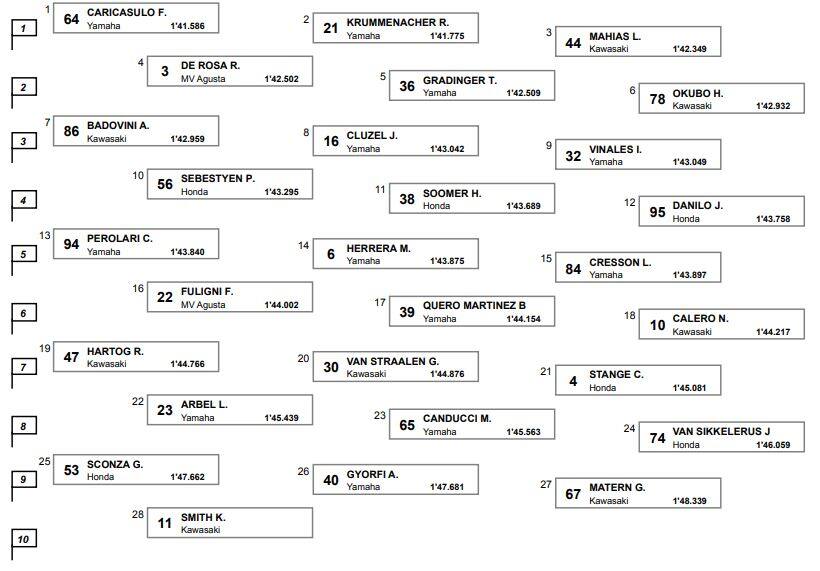 Doppietta per il team Evan Bros in Superpole, con Caricasulo in pole davanti a Krummenacher. Terzo Mahias, poi De Rosa. La prima gara della 300 va a Garcia, che batte in volata Deroue. Carrasco al primo podio stagionale. Domenica la Super Pole Race alle 11 e gara 2 alle 14. In pista anche Supersport e Supersport 300 con gare domenica alle 12.10 e alle 15.10