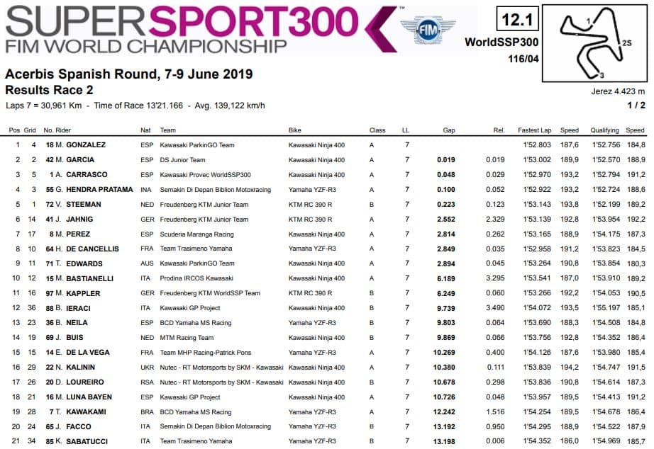 La gara della Supersport 300 è stata combattuta come al solito fino alla fine, ma a fare la differenza sono stati i cinque piloti che avevano fatto il vuoto anche in qualifica. Manuel Gonzalez ha sfruttato la scia di Marc Garcia, che lo aveva superato all'ultima curva, per tornargli davanti e precederlo sul traguardo. Terza posizione per Ana Carrasco davanti a Galang Hendra Pratama e Victor Steeman. Due italiani in zona punti: decimo Manuel Bastianelli al miglior risultato stagionale, Bruno Ieraci dodicesimo.