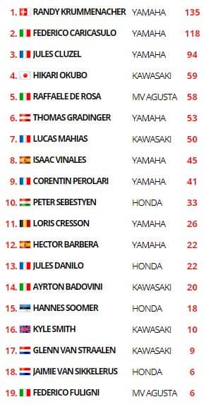 Federico Caricasulo sbanca Jerez con vittoria e record della pista in gara all'ultimo giro, dopo essere stato privato della pole position per via di una penalizzazione: nel suo miglior giro in qualifica, non avrebbe infatti rallentato in un tratto interessato da una bandiera gialla; lo stesso provvedimento è stato preso per Raffaele De Rosa (da quarto a quinto in griglia) e Federico Fuligni (rimasto sedicesimo). In una gara di gruppo con sei moto coinvolte, Caricasulo è stato bravo a scattare nel momento giusto, a tre giri dal termine, superando Jules Cluzel e mettendolo tra sé e Randy Krummenacher. Lo svizzero ha passato il francese, ma il distacco accumulato dal leader era ormai troppo grande; inoltre, Caricasulo ha girato comunque più forte del compagno di squadra nelle ultime fasi. Sono proprio Krummenacher e Cluzel a chiudere il podio in quest'ordine. Thomas Gradinger beffa Raffaele De Rosa nel finale per la quarta posizione, mentre Lucas Mahias molla proprio negli ultimi giri e chiude sesto. A completare la top-10 sono Hikari Okubo, Isaac Vinales, Corentin Perolari e Peter Sebestyen. Gli altri italiani: Ayrton Badovini 13°, Michael Canducci 19°, Gianluca Sconza 20°, con Federico Fuligni ritirato.