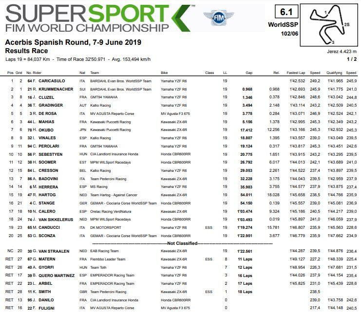 Gestendo al meglio gomme e avversari, Caricasulo coglie il successo a Jerez. Secondo Krummenacher davanti a Cluzel, buona gara per De Rosa. Per Gonzalez è la terza vittoria su quattro gare; dietro di lui Garcia e Carrasco.