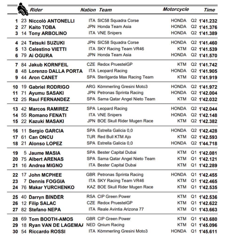 Prima fila quasi tutta italiana, con Antonelli davanti a tutti e Arbolino terzo, ma in seconda c’è anche Celestino Vietti, al debutto sul tracciato olandese. Canet e Dalla porta attardati in terza fila. Partenza in salita per Fenati, Miglio e Foggia