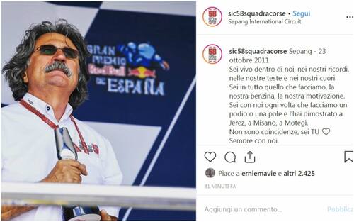 "Sei vivo dentro di noi, nei nostri ricordi, nelle nostre teste e nei nostri cuori. Sei in tutto quello che facciamo, la nostra benzina, la nostra motivazione. Sei con noi ogni volta che facciamo un podio o una pole e l’hai dimostrato a Jerez, a Misano, a Motegi. Non sono coincidenze, sei TU. Sempre con noi, sempre nel cuore". Questo il messaggio apparso sul profilo ufficiale Instagram della Squadra Corse Sic58