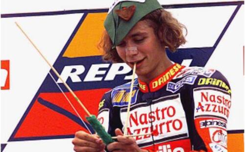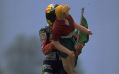 La prima è una delle più famose, quand'era ancora un ragazzino: dopo aver vinto in 125 al Mugello, Vale fece un giro di pista con la bambola gonfiabile "Claudia Skiffer" -