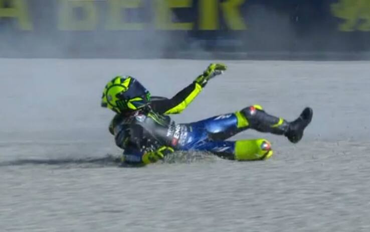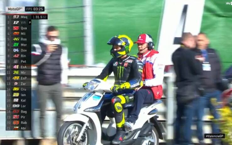 Non inizia nel modo sperato, l'ultimo GP della stagione di Valentino Rossi: due cadute per lui sul tracciato di Ricardo Tormo, una per sessione. La buona notizia da Valencia è che in entrambi i casi non ci sono state conseguenze per il pilota, che è riuscito a rialzarsi e rientrare ai box in scooter. Dinamica simile, Vale perde l’anteriore, ma cambiano le curve. La prima scivolata avviene alla 4 a pochi minuti dal termine del turno, chiuso con l'8° tempo.