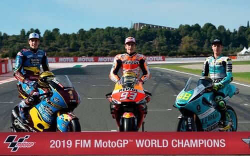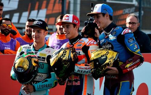 Il 17 novembre ecco a Valencia la classica foto con i tre campioni del mondo: Alex Marquez in Moto2, il fratello Marc in MotoGP e Lorenzo Dalla Porta in Moto3