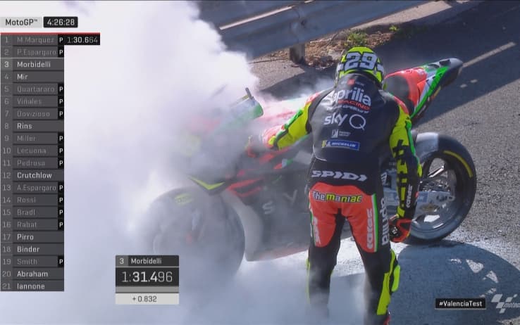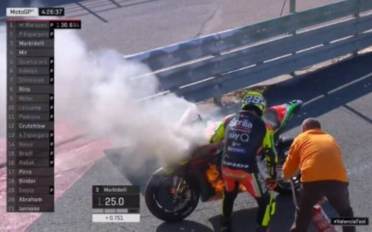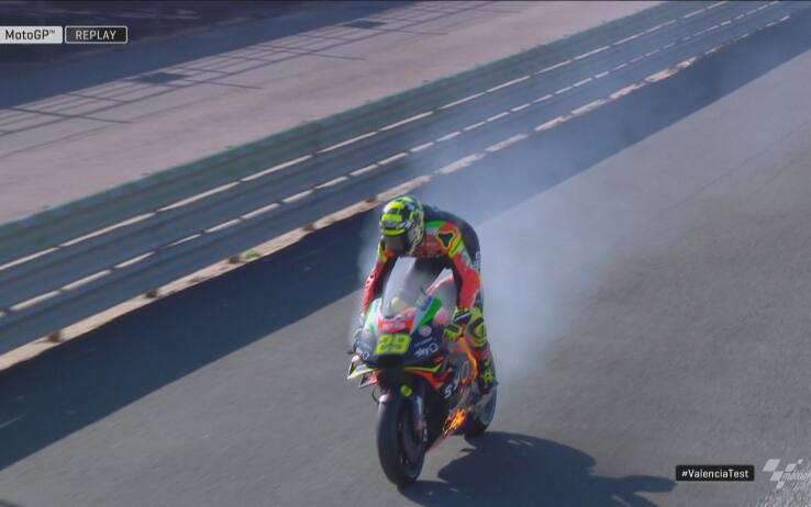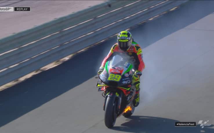 Nella seconda giornata di test a Valencia, imprevisto per il pilota Aprilia: la sua moto prende fuoco in uscita dai box. Un grande spavento per l'abruzzese, che poi si sfoga con i suoi tecnici: "Mi ammazzo contro il muro, è 10 volte che dico che la moto non va"