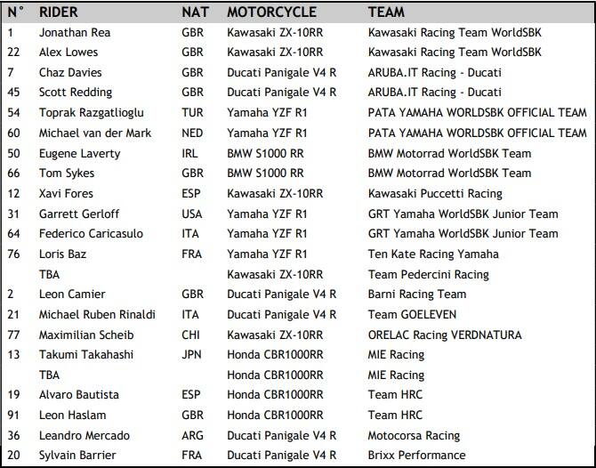 La FIM ha ufficializzato la lista dei piloti iscritti alla nuova stagione di Superbike, che avrà il via nel weekend tra il 28 febbraio e il 1° marzo in Australia. In casa Kawasaki, al fianco del campione del Mondo Jonathan Rea, c'è Alex Lowes, il cui posto in Yamaha è stato occupato dal turco Toprak Ratzatlioglu. La new entry di lusso si chiama Scott Redding: arriva in Ducati al posto di Alvaro Bautista. Lo spagnolo guida (insieme a Leon Haslam) il team Honda HRC, entrata ufficialmente nel paddock SBK