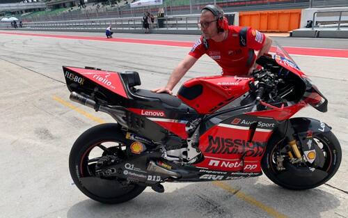 Meccanici all'opera nel box Ducati per risolvere alcuni piccoli problemi tecnici sul telaio 2020 riscontrati venerdì
