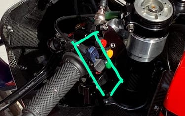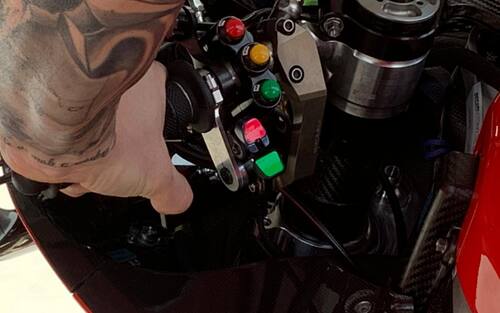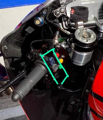 Già un anno fa la Ducati aveva introdotto il dispositivo "holeshot", ovvero quella farfalla sul piatto di sterzo che permetteva ai piloti Ducati di abbassare la moto alla partenza. Il variatore di altezza è un'ulteriore evoluzione, nel senso che i piloti premendo i pulsanti sopra indicati possono variare l’altezza della moto quando è in marcia. Questo permette di avere l’altezza migliore possibile a seconda del punto della pista in cui si corre. In pratica, sul dritto i piloti possono abbassare la moto migliorando l’efficienza aerodinamica e evitando eccessivi trasferimenti di carico. In foto la moto di Andrea Dovizioso, che ha voluto personalizzare i pulsanti con i colori rosso e verde