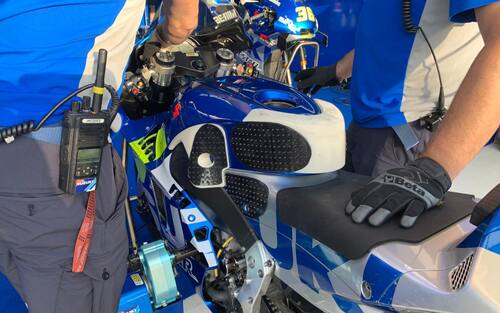 Al box Suzuki, lavoro sulla moto di Joan Mir: per migliorare la posizione di guida del piloa spagnolo, apportati dei supporti sul copriserbatoio e sui lati per avere più sostegno