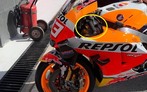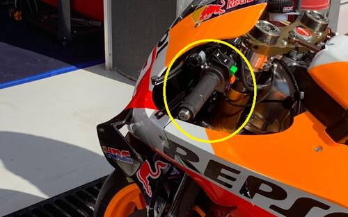 Un dettaglio sulla Honda di Marc Marquez. il pilota spagnolo monta su entrambe le moto a sua disposizione il freno posteriore a leva