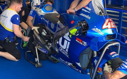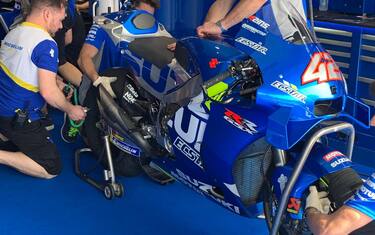 Il leader del Day-1, Alex Rins, nella seconda giornata ha compiuto prove comparative tra il nuovo e vecchio telaio. In foto la versione 2020, interamente in alluminio