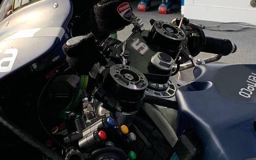 In casa Ducati continua il lavoro sull'holeshot 2.0, già mostrato nei test di Sepang e nel Day-1 in Qatar. Il dispositivo (in foto la moto Pramac di Bagnaia) migliora l’efficienza aerodinamica, perché l’assetto aerodinamico rimane neutro, ma cosa più importante, con questa condizione il pilota può frenare più tardi, considerando il minore trasferimento di carico. Quando poi si arriva in staccata, toccando il freno, o premendo il tasto blu, l’ammortizzatore viene sbloccato e la moto si rialza sul posteriore, con un assetto adatto a curvare (un retrotreno basso renderebbe l’anteriore instabile)