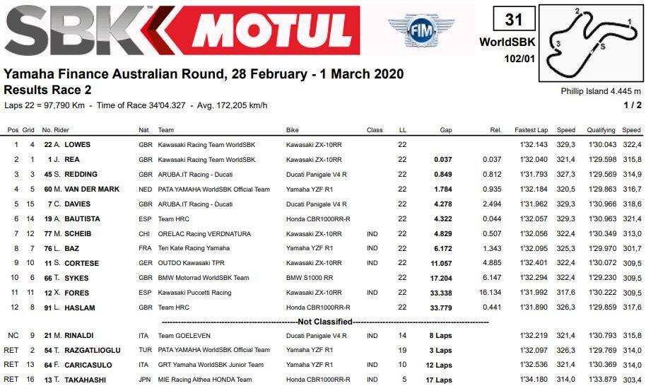Sono solo dodici i piloti al traguardo, con Sandro Cortese non a precedere Sykes, Xavi Fores e Haslam. L’inglese di casa Honda è stato protagonista di un contatto con Rinaldi nelle prime fasi di gara, che ha causato la caduta dell’italiano mentre si trovava tra i primi. Ritirati, oltre a Razgatlioglu, anche Federico Caricasulo e Takumi Takahashi, mentre Garrett Gerloff ed Eugene Laverty sono stati dichiarati unfit (commozione cerebrale) per entrambe le corse dopo essere caduti nel warm up. Il bilancio di Phillip Island vede Lowes in testa al campionato con cinquantuno punti, dodici in più del più vicino inseguitore Redding, in attesa della seconda prova stagionale prevista tra due settimane in Qatar.