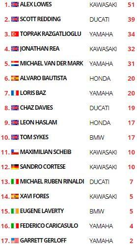 Scott Redding archivia il terzo arrivo al terzo posto del weekend, riuscendo a precedere un Van Der Mark che invece ha raccolto meno di quanto il suo stato di forma avrebbe meritato. La gara particolarmente lenta ha permesso anche a Chaz Davies e Alvaro Bautista, quinto e sesto, di rimanere a contatto con il gruppo e portare a casa buoni risultati. Brilla in settima posizione Maximilian Scheib, primo dei piloti dei team indipendenti e bravo a far parte del serpentone di testa per tutta la corsa. Dietro di lui chiude un Loris Baz velocissimo e aggressivo, ma sfortunato.