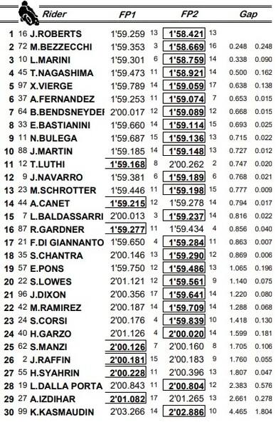 Chi sono gli avversari? Difficilmente quel Joe Roberts, che ha persino abbassato il record della pista in FP2: l’anno scorso l’americano ha messo insieme quattro punti in tutto. Certo, una bella partenza la sua, ma un miracolo al momento sembra ancora improbabile. Piuttosto Augusto Fernandez (sesto crono per lui nella combinata), l’inossidabile Luthi (undicesimo), lo spagnolo Navarro, uomo di punta del team Beta di Luca Boscoscuro che schiera anche Fabio Di Giannantonio, altro pilota a cui stare attenti (per ora, però, fuori dalla top quattordici con il diciassettesimo tempo di giornata).