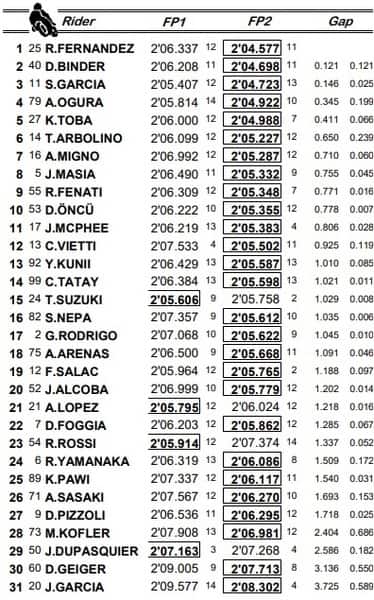La classifica mette Raul Fernandez al primo posto, per ora, ma ci sono tanti possibili protagonisti alle sue spalle, nella cosiddetta top quattordici che segna il confine tra chi entra diretto in Q2 e chi deve invece sgomitare in Q1.