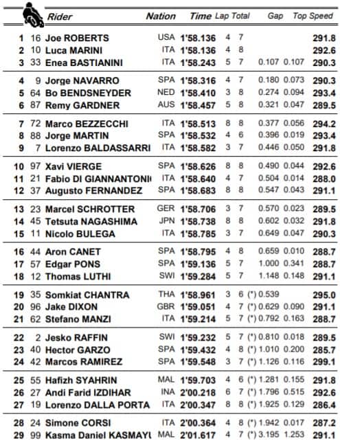 LosailJoe Roberts è fin qui la rivelazione del GP del Qatar: appena 4 punti in tutto il 2019, è ripartito alla grande conquistando la pole nelle prime qualifiche del 2020. Alle sue spalle un Marini in grande forma, terza casella per Bastianini