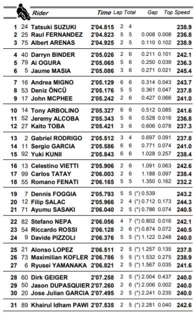“Tatstu” ha superato, non senza polemiche, lo scoglio della Q1, chiusa con un battibecco. Lopez, che si è sentito rallentato dal pilota del team Sic58, senza giri di parole l’ha mandato platealmente a quel paese, con sportellata finale che ha mandato fuori strada il riccionese di Chiba (chissà che cosa hanno pensato in direzione gara…). In Q2 dopo aver segnato un tempo imbattibile nei primi giri, Tastuski si è seduto al box, in attesa che gli sistemassero l’inconveniente tecnico.