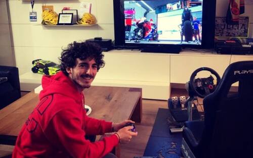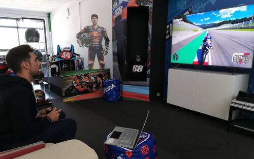 ALEIX ESPARGARO' (Aprilia) - A proposito di moto italiane, ci sarà anche il più grande dei fratelli Espargaró alla guida di un'Aprilia. Qui lo vediamo impegnato, proprio come Rins, in una sessione di gioco con volante e pedali in un titolo di automobili