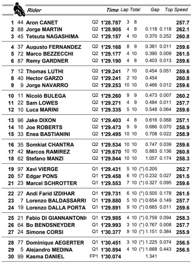 La qualifica delle occasioni mancate. Tutti pronti a scommettere su Bezzecchi (molto promettente nelle prove) e alla fine spunta Canet. Il romagnolo ha chiuso con un buon quinto posto e il conforto di un ritmo gara consistente, ma certo, l’acquolina in bocca gli è rimasta per una prima fila che sembrava ormai certa.