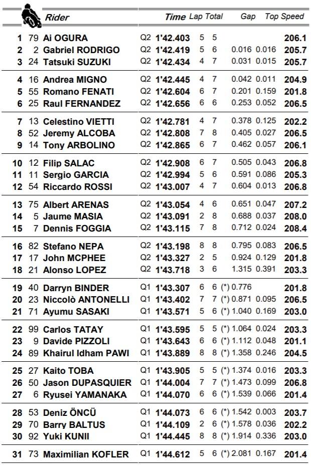 Ai Ogura riporta il Giappone in pole position in Moto3. Prima volta per il pilota del Team Honda Asia, che in classifica occupa tra l'altro la seconda posizione alle spalle di Albert Arenas (tredicesimo). Diciannove anni, di Tokyo, fino ad oggi Ogura aveva colpito per la costanza dei risultati in gara, dove si è già preso quattro podi in sei appuntamenti. Con un pizzico di fortuna e un po' di furbizia ha strappato all’ultimo giro la prima posizione al veloce Gabriel Rodrigo, quando era ormai sicuro di averla messa in banca.