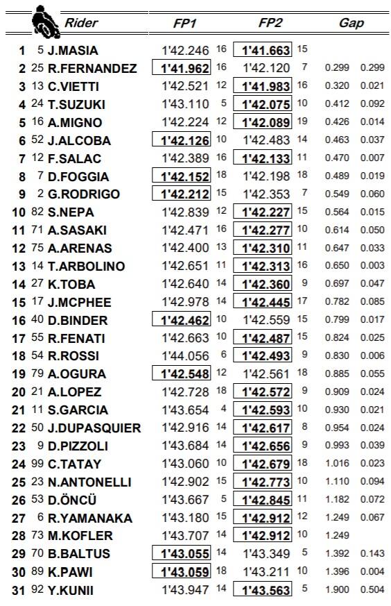 Livello alto, tempi molto significativi, tutti a caccia di una qualifica che promette una FP3 bollente. Dovrà darsi una mossa McPhee rimasto fuori, per ora, insieme a Binder, Fenati e soprattutto Ogura, secondo classificato domenica scorsa e primo avversario in classifica di Albert Arenas, solo dodicesimo nella combinata, anche per la penalizzazione che l’ha obbligato al box per i primi dieci minuti della FP2. Penalità scontata insieme ad altri sette piloti, per i soliti giochetti nella sessione precedente. In FP3 si rischia d’ora in poi di perdere gli ultimi 15 minuti, e quindi la possibilità di giocarsi l’accesso diretto alla qualifica finale, ma se ciò basterà a ridurre i comportamenti scorretti in prova si vedrà.