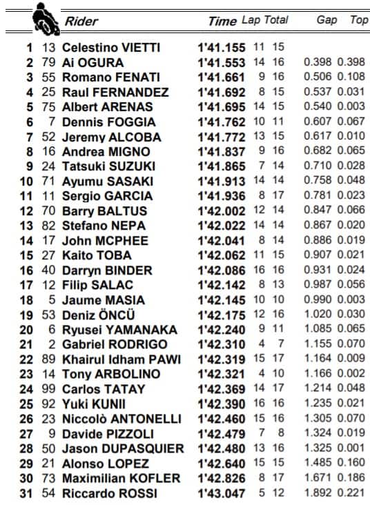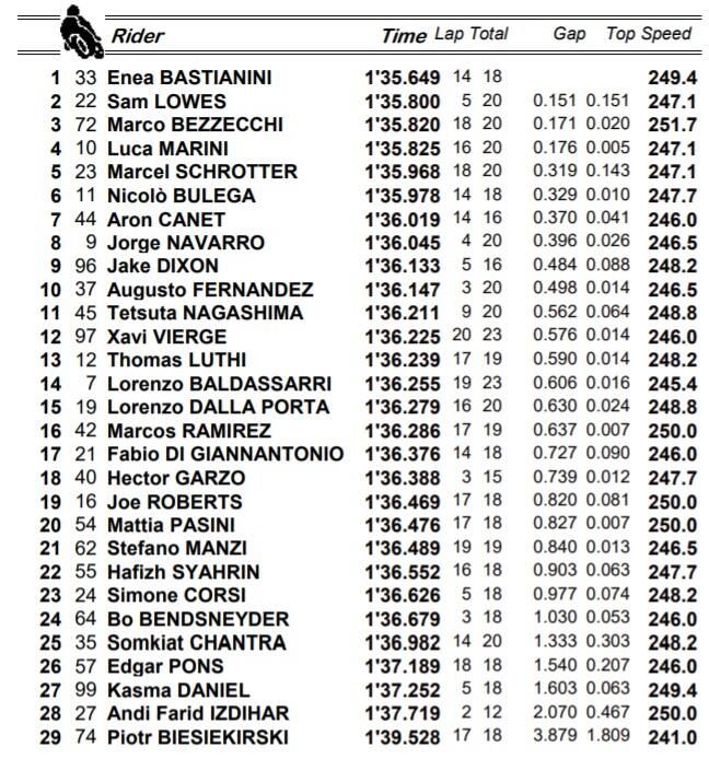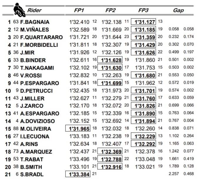 Bel salto avanti di Valentino Rossi. Il pilota Yamaha, che ea 15° dopo le prime due sessioni di prove, sale fino all’ottavo posto dopo le Libere 3, riuscendo a qualificarsi per il Q2. Bene anche Danilo Petrucci, che nelle Libere 2 era già apparso in ripresa rispetto al disastroso GP di San Marino. Il pilota Ducati chiude in 10^ posizione e accede al Q2. Dovrà invece passare dal Q1 l’altro pilota ufficiale Ducati, Andrea Dovizioso: l’attuale leader del Mondiale è solo 14° nella classifica dei tempi combinati. Nelle Libere 3 da segnalare due cadute senza conseguenze per Pecco Bagnaia e Pol Espargaró.
