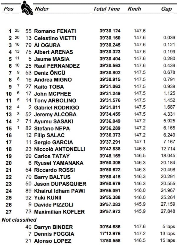 Celestino Vietti, pilota dello Sky Racing Team VR46, ha forzato ogni staccata, risposto a ogni assalto. Gara autorevole che avrebbe meritato anche il primo gradino del podio (è il suo terzo podio stagionale), ma la classe minore è così. Ed è il suo bello in fondo. Masia ha pagato anche di più, superato da Arenas che si tiene il primo posto in classifica. Giusto due punti su Ogura, che ha accorciato con il terzo posto (dopo essere partito undicesimo). Fenati e Vietti a parte (prima doppietta italiana in Moto3 a Misano), gli altri italiani non hanno brillato. Arbolino, inconsistente sulla distanza ha chiuso undicesimo, Migno ottavo, Antonelli diciottesimo (ennesima gara anonima del romagnolo), Foggia è scivolato, Rossi ventunesimo e Pizzoli ventiseiesimo.