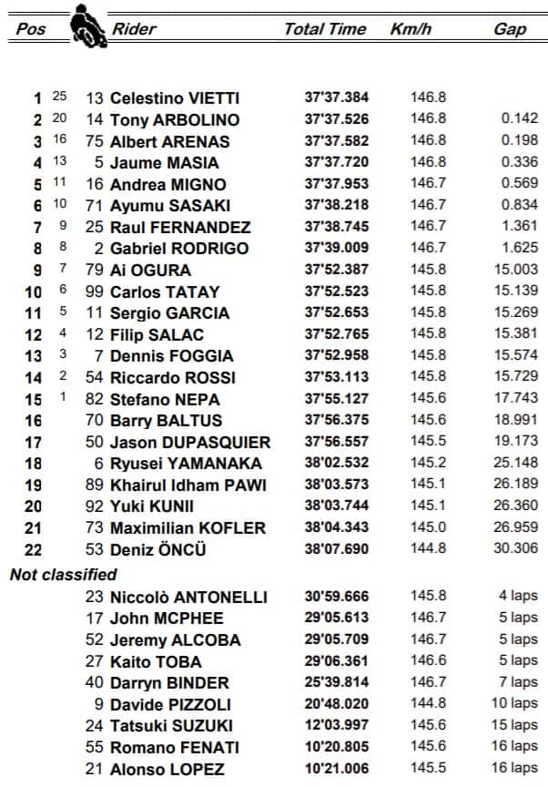 Nella seconda parte di gara cresce Vietti. Masia cede il passo ad Arenas al comando del gruppo di testa, formato da Binder, Masia, Arbolino e dal piemontese. Il nome del vincitore sembra essere uno tra Arenas e Masia. E invece a due giri dalla fine Vietti li sorprende entrambi e con uno strepitoso soprasso all’interno, stile due in uno, si porta in prima posizione. Alla prima curva dell’ultimo giro, anche Arbolino sorpassa Arenas e si porta in P2. Da questo momento non cambia più niente là davanti, perché Vietti è bravissimo a chiudere tutte le porte e conquista la sua seconda vittoria nel Motomondiale, dopo quella di due mesi fa nel GP di Stiria. Secondo è Arbolino, terzo Arenas, nuovo leader del Mondiale. Ma adesso Celestino è a soli 16 punti dallo spagnolo, e Arbolino a 20.