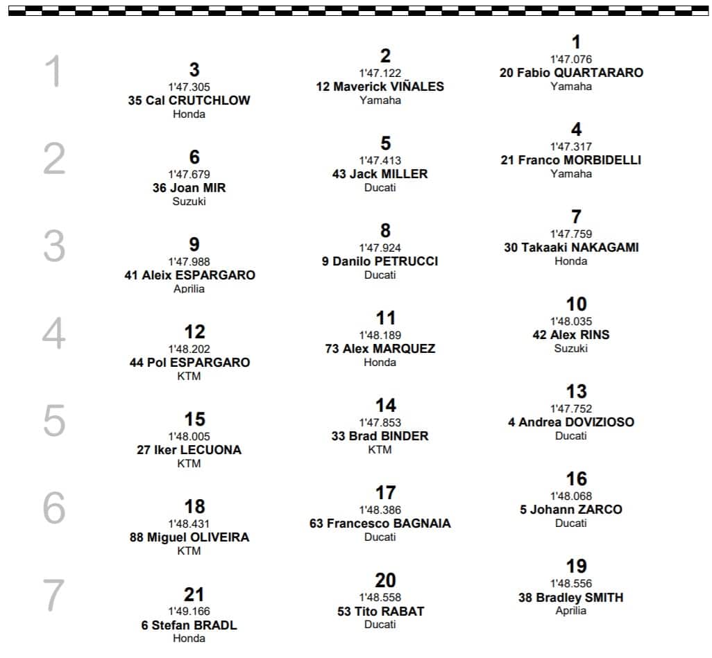 Quartararo partirà davanti a tutti in Spagna: il francese spezza una sequenza di 8 pole spagnole consecutive ad Aragon. Alle sue spalle c'è Vinales, unica Yamaha ufficiale in gara vista l'assenza di Rossi, risultato positivo al Covid. Crutchlow completa la prima fila, confermando i progressi della Honda negli ultimi GP. La migliore Ducati in griglia è quella di Miller (5°). Più staccate le altre Ducati: 8° Petrucci, 13° Dovizioso, 17° Bagnaia. Partenza posticipata alle 15
