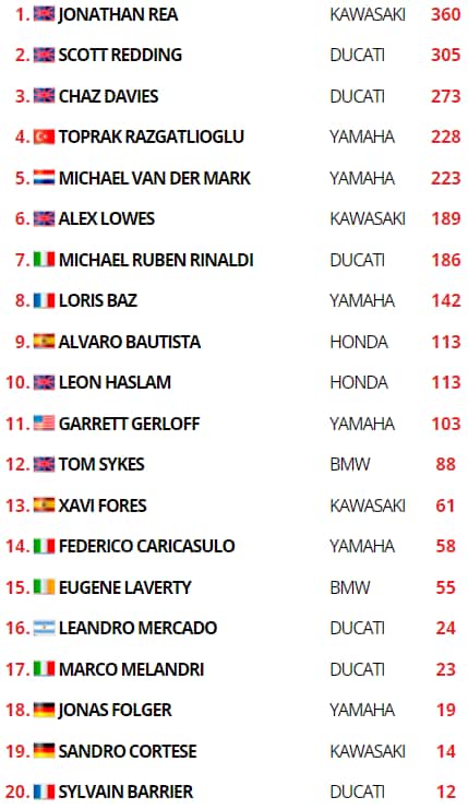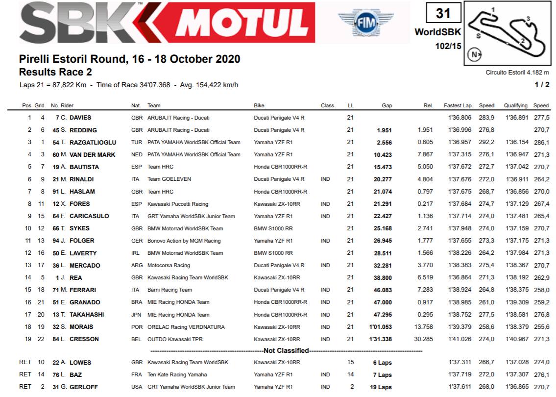 Gara 2 si preannunciava molto avvincente, ma Davies ha fatto la voce grossa fin da subito andando in fuga e vincendo la sua ultima gara in sella alla Ducati ufficiale, salutando con commozione la squadra che è stata la sua famiglia negli ultimi sette anni. Caduti Rea e Gerloff, il secondo posto è stato un affare tra Razgatlioglu e Redding, con l’inglese che nelle fasi finali si è velocizzato chiudendo il gap e scavalcando il rivale. Ducati si è assicurata dunque l’uno-due sul podio, nonché (in ordine inverso) il secondo e il terzo posto in classifica generale; il titolo costruttori va invece a Kawasaki per un solo punto.