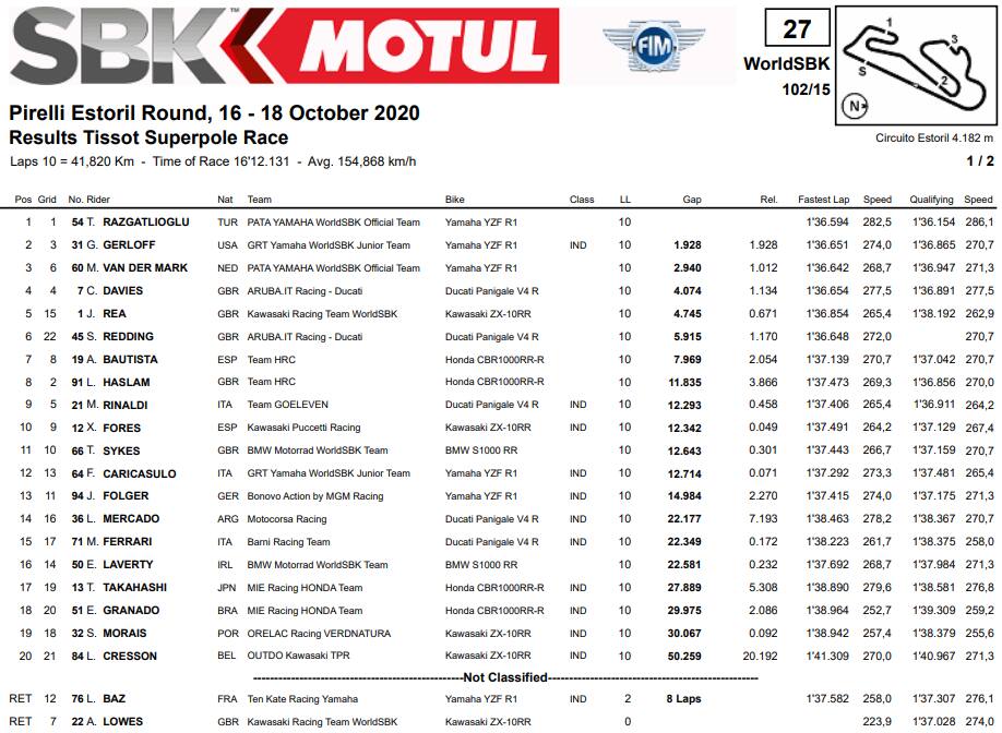 Il mondiale Superbike 2020 va in archivio con la domenica di Estoril, nella quale a farla da padroni sono stati prima Toprak Razgatlioglu e poi Chaz Davies. Il turco ha replicato il successo di Gara 1 in una Superpole Race nella quale ha dominato, precedendo sul traguardo le altre Yamaha di Garrett Gerloff e Michael Van Der Mark. Davies ha chiuso quarto davanti a Jonathan Rea e Scott Redding, con Alvaro Bautista, Leon Haslam e Michael Ruben Rinaldi ad occupare le ultime tre posizioni in zona punti.