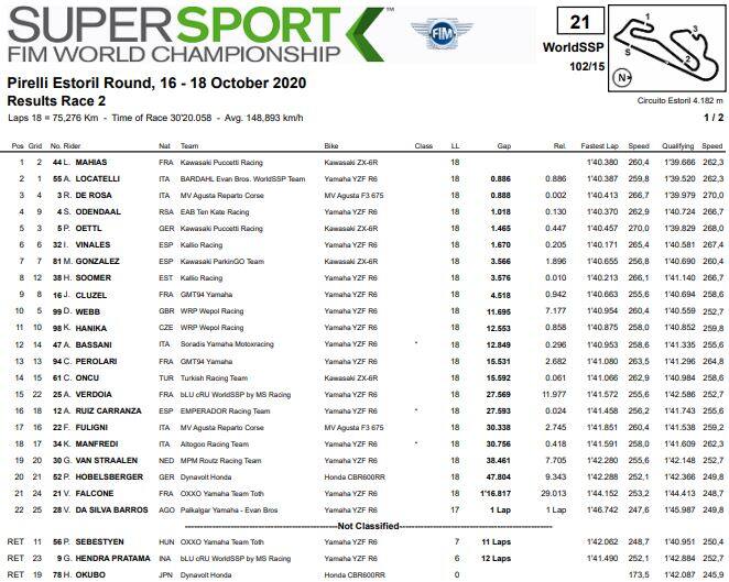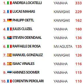 Il secondo posto è andato ad Andrea Locatelli che ha preceduto al photofinish De Rosa, mentre ai piedi del podio termina Steven Odendaal, passato all’ultimo giro davanti a Philipp Oettl. Sesto Isaac Vinales seguito da Manuel Gonzalez e Hannes Soomer, con Jules Cluzel nuovamente in top-10 insieme a Danny Webb. Dodicesima posizione per Axel Bassani, fuori dai punti invece Federico Fuligni (17°) e Kevin Manfredi (18°) che conquista la prima posizione nella classifica del campionato europeo.