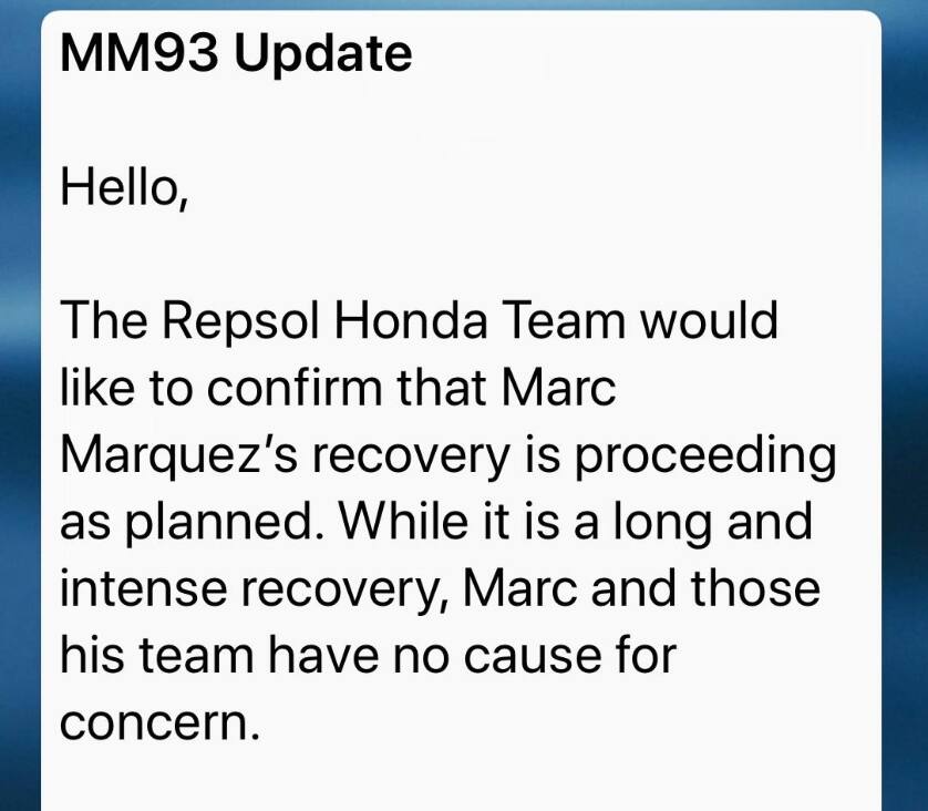 Con un messaggio inviato alla stampa, dunque, la Honda ha spiegato qual è la situazione attuale di Marc, di fatto smentendo le voci spagnole: "Il recupero procede come programmato. Non c'è preoccupazione, si tratta di un recupero lungo e intenso".
