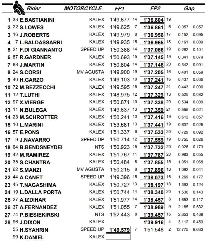 Sei italiani nei primi quattordici, quelli virtualmente ammessi alla Q2. Si è chiusa così la prima giornata di prove in Moto2, con Bastianini primo dei nostri e più veloce in assoluto in pista. Un bel colpo di reni, rispetto al mattino, chiuso all’8° posto. Buone notizie anche da parte di un ritrovato Baldassarri (4°), un più costante Di Giannantonio (5°), un rinato Corsi con la Mv (8°), un bravo Bezzecchi (10° ma quasi più efficace sul bagnato del mattino che sull’asciutto del pomeriggio) e infine Nicolò Bulega, 13° con un distacco risicato di 5 decimi dalla vetta di giornata. Dove, un gradino più sotto rispetto a Bastianini, si è piazzato Lowes, sempre più convincente (con l’unica pecca di una scivolata in FP2…). Il britannico è in forma splendida e super motivato da quando ha agguantato il vertice del mondiale. Un brutto cliente per Bastianini, che lo insegue in classifica e soprattutto per Luca Marini, subito alle spalle del romagnolo. Il pesarese ha chiuso una giornata in salita al 15° posto, quasi irriconoscibile a tratti, in particolare sul bagnato dove ha penato oltre il previsto. Rispetto al Marini dominatore per due terzi del campionato, un altro pilota. Venerdì era oltretutto importante centrare le prime quattordici posizioni perché sabato mattina in FP3, ultima chiamata per entrare direttamente in Q2, potrebbe anche piovere.