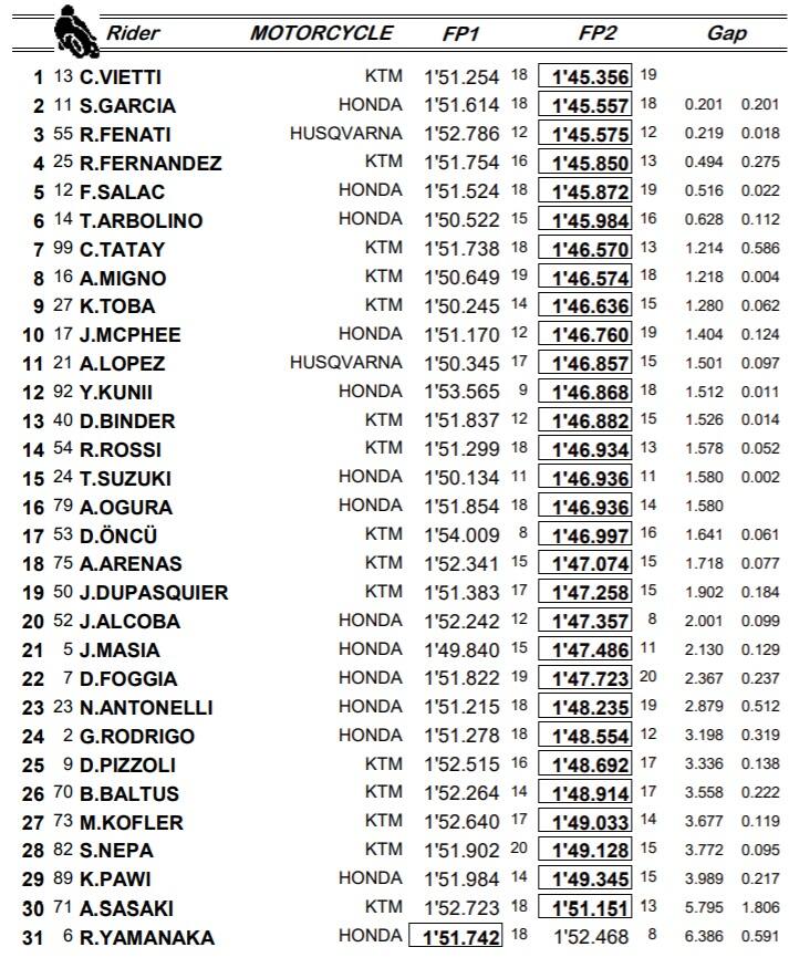 In ottica campionato, un‘ottima notizia dal momento che il piemontese insegue staccato di venti lunghezze. E’ troppo presto per sbilanciarsi in pronostici, ma se il buon giorno si vede del mattino… Nel novero delle buone notizie rientra anche il terzo miglior tempo di Romano Fenati e il sesto di Arbolino, tra i più forti sull’acqua (nonostante l’innocua scivolata del milanese nel primo turno di libere). Bene anche Migno (8°) e Riccardo Rossi (14°). Fuori dai quattordici Suzuki e Antonelli che l’anno prossimo dovrà lasciare il posto nel team di Paolo Simoncelli.