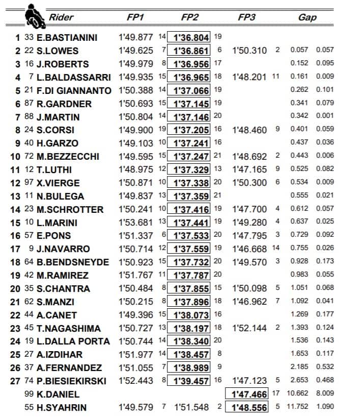 La terza sessione del GP Europa si è svolta su asfalto bagnato, per via della pioggia caduta all'alba su Valencia. Il più veloce è stato Zarco, davanti a Vinales e Nakagami. Tuttavia nessuno dei piloti è riuscito a migliorare il proprio tempo rispetto al venerdì, resta valida quindi la classifica combinata registrata al termine delle Libere 2: Miller in testa, alle sue spalle Aleix Espargaró e Mordibelli, 8° Dovizioso. Rossi è tornato in pista, a quasi un mese di distanza dall’ultima gara (11 ottobre, GP di Francia a Le Mans). Valentino ha chiuso all’ottavo posto nelle Libere 3, con un ritardo di +1.635 dal leader della sessione Zarco. Non essendo sceso in pista nelle prime due sessioni di prove, Rossi è dovuto passare inevitabilmente dal Q1, chiuso con l'8° tempo. Vinales, 15° nel Q2, in gara partirà dalla pit-lane: guadagna così un posto in griglia Valentino, che scatterà dalla 17^ posizione.