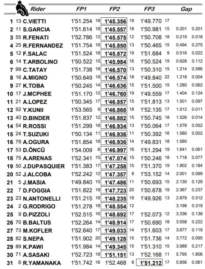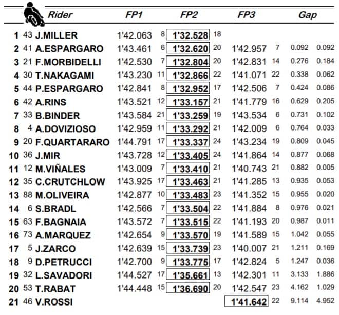 valenciaDopo quasi un mese di assenza a causa del Covid, Rossi è tornato a guidare la sua Yamaha nelle Libere 3 del GP Europa: sessione chiusa con l'ottavo tempo. Asfalto bagnato a Valencia, non cambia la classifica combinata: Miller resta in testa davanti ad Aleix Espargaró e Mordibelli